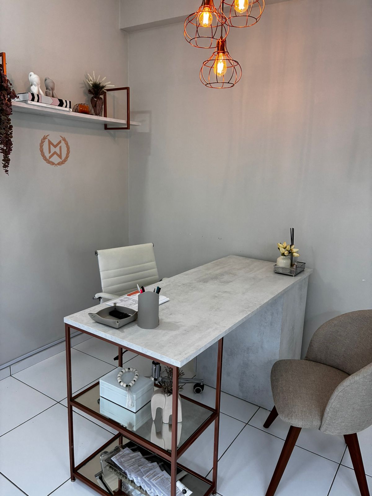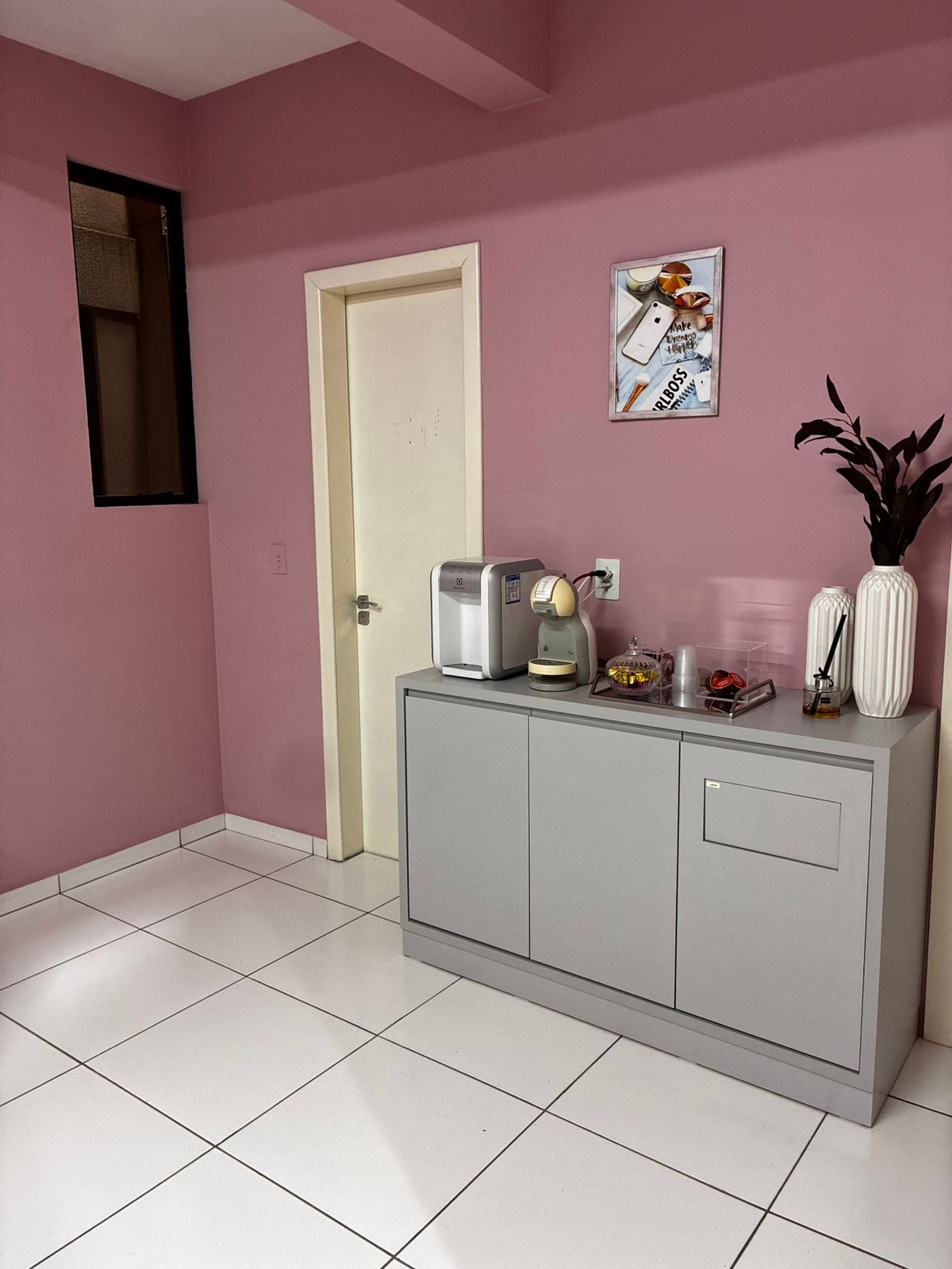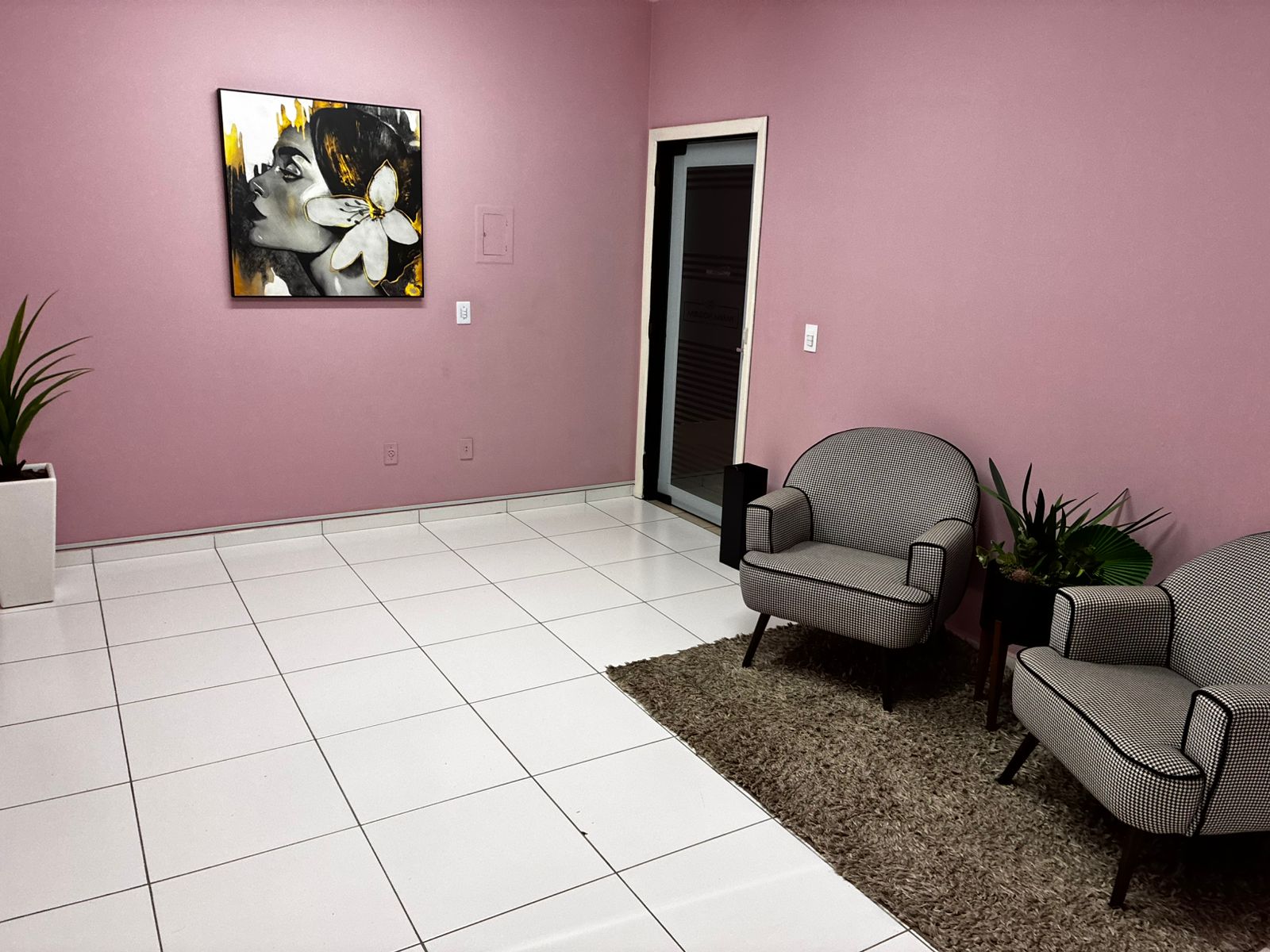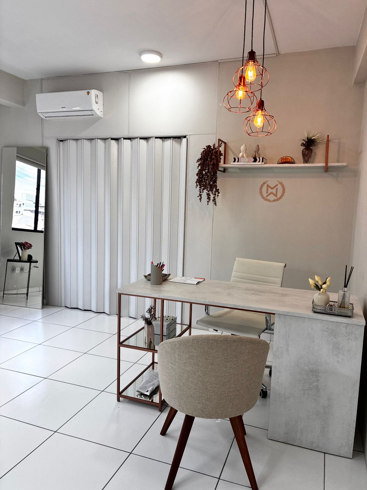 Possui sala de recepção; banheiro social; copa; duas salas, sendo uma delas já pronta e uma delas vazia.